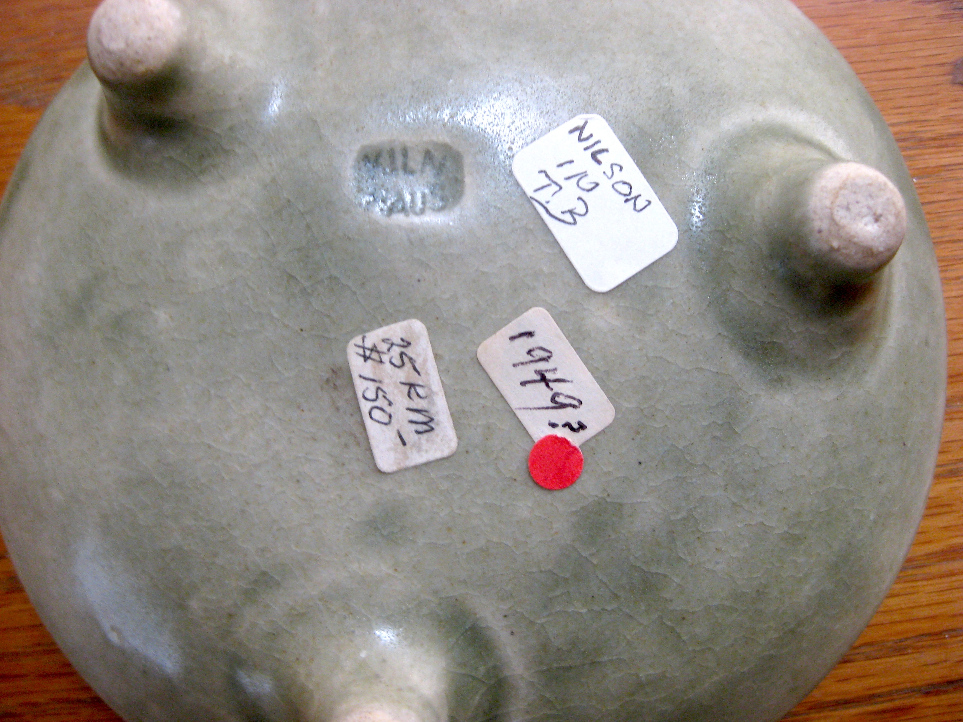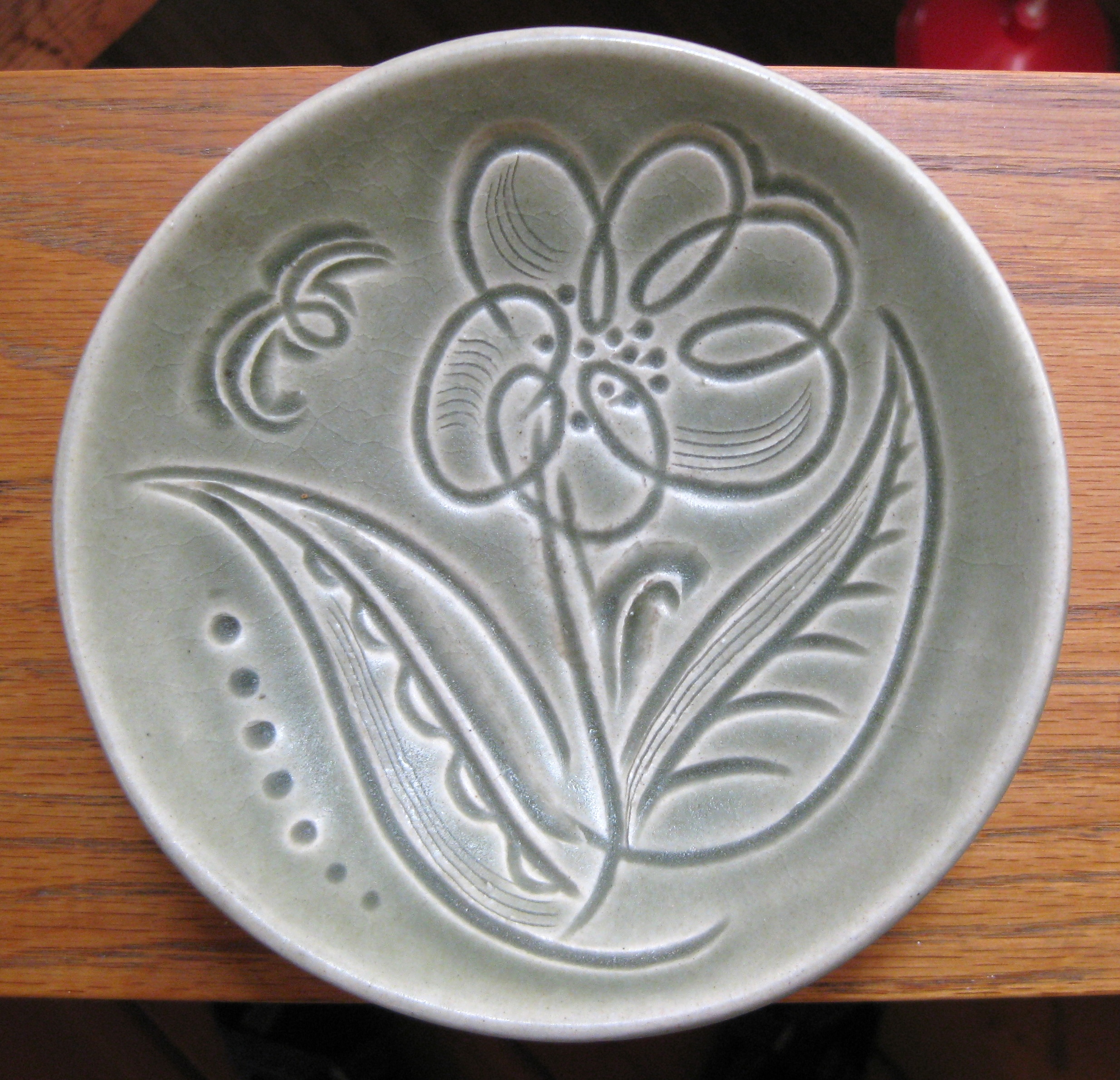 Light-hearted flower incised in celadon bowl by Karl Martz, undated.