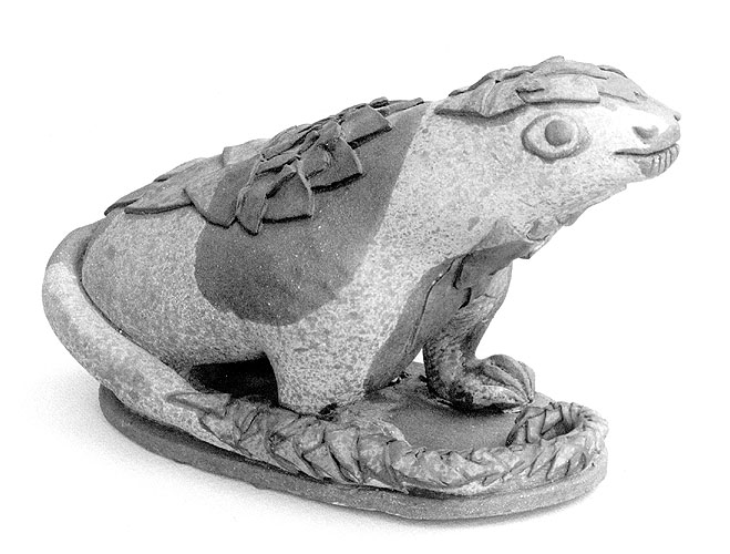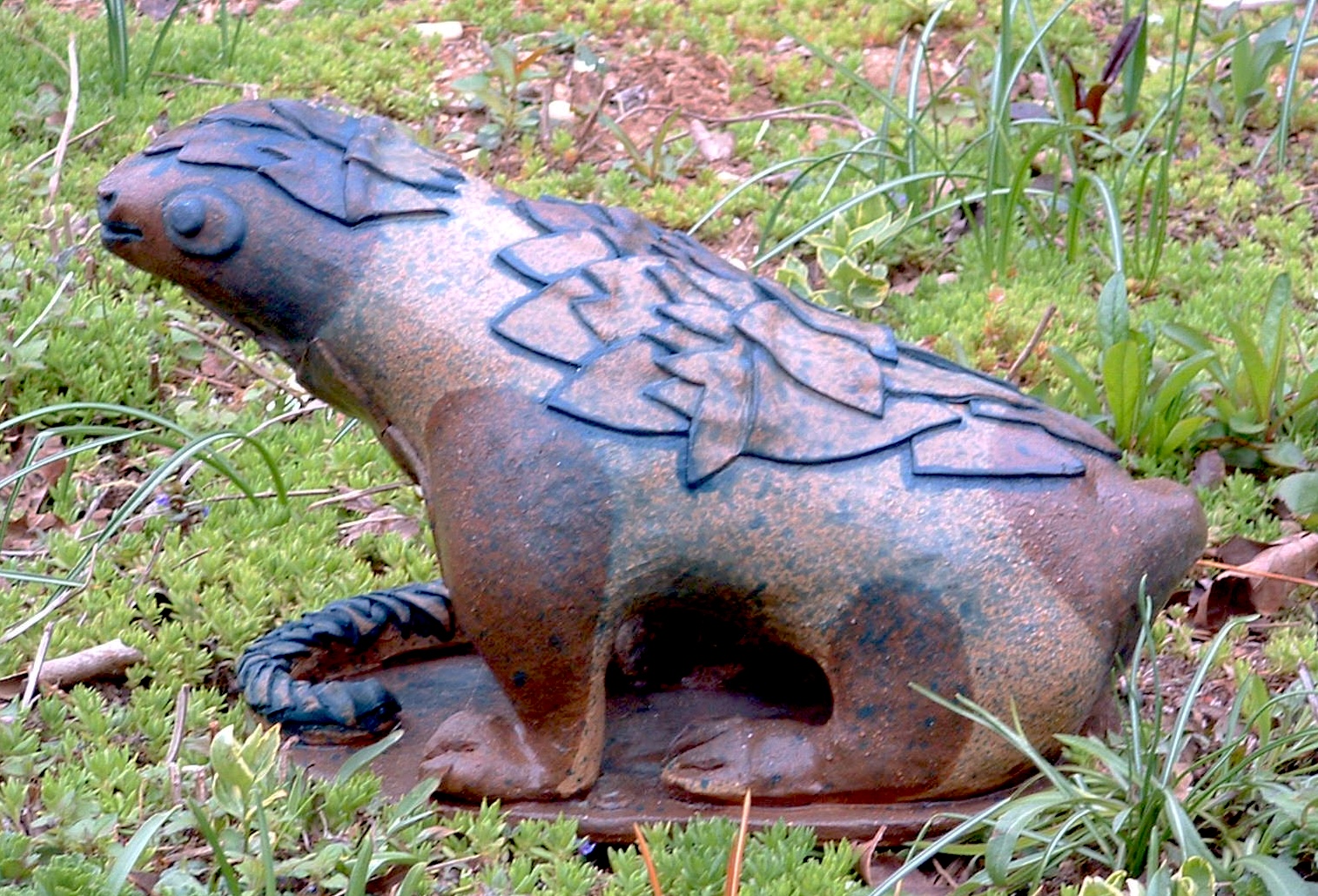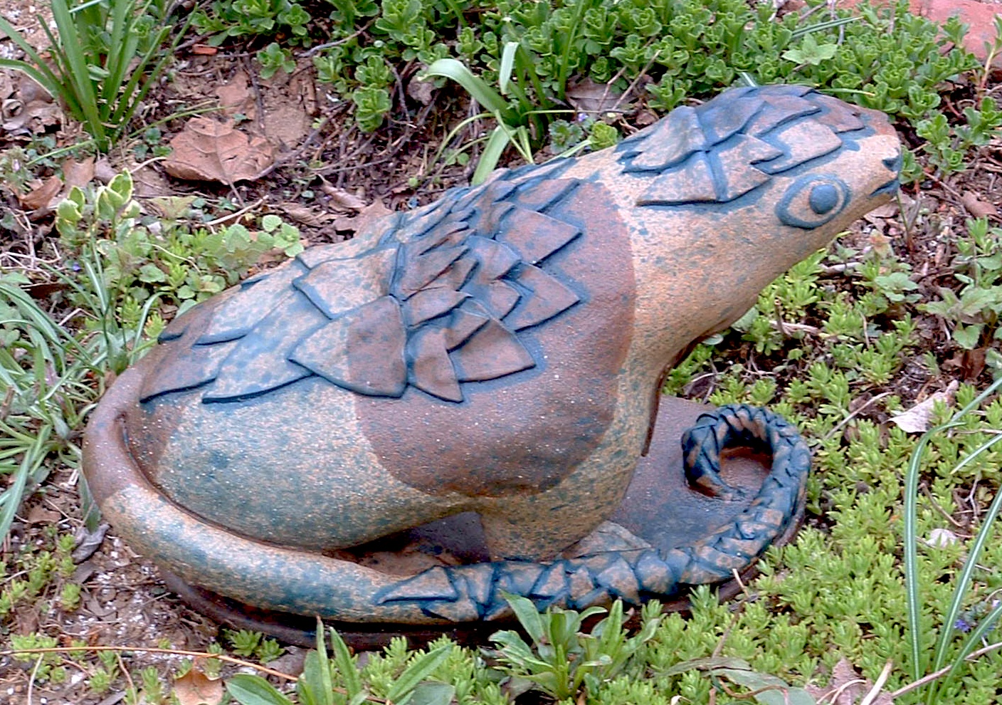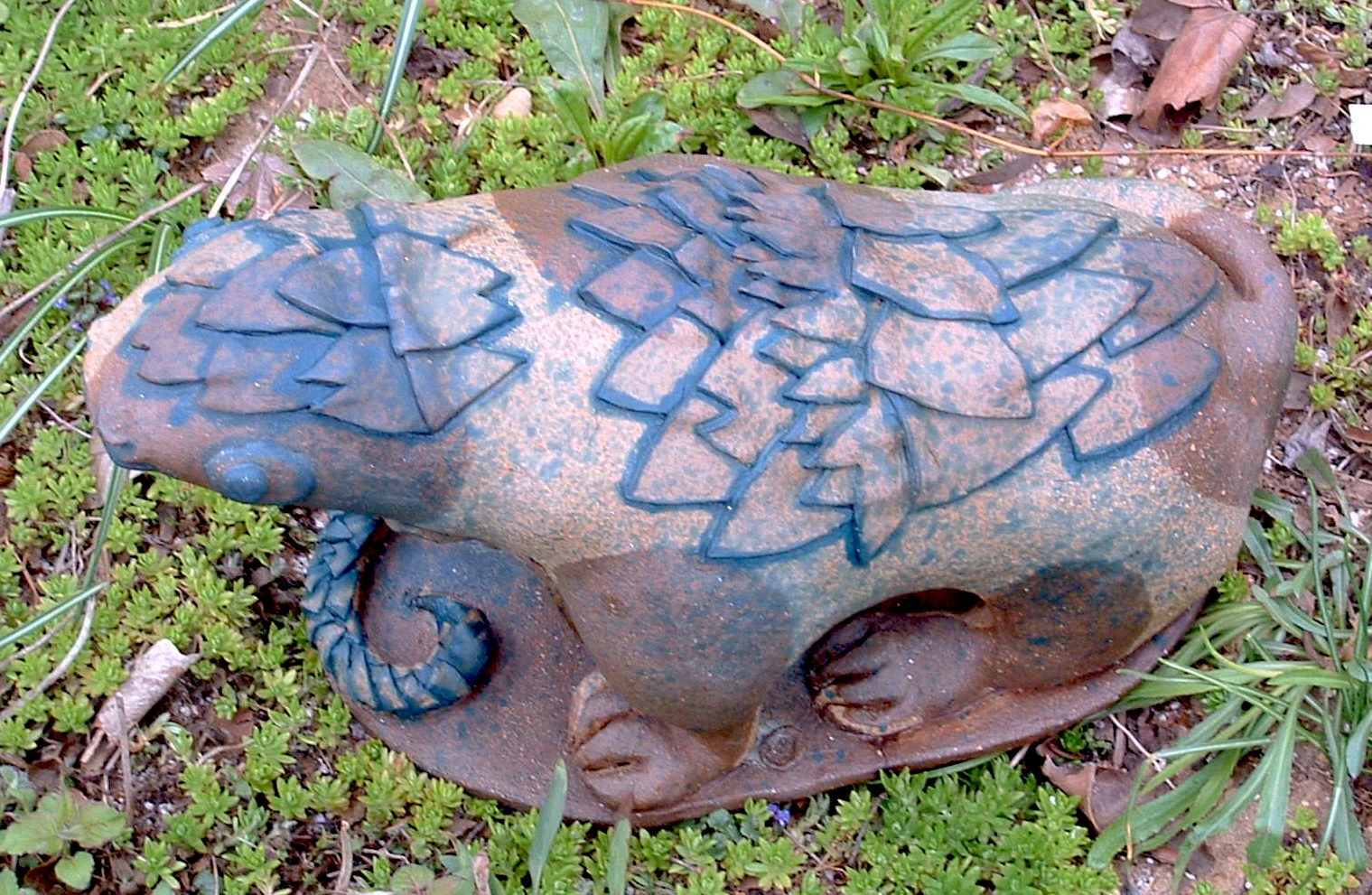 Unglazed earthenware, cone 3, brown and blue grays, stained with soluble salts.