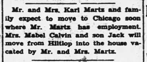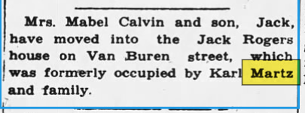 Below are some clippings from the Brown County Democrat newspaper that provide boundaries for the dates when the Martz family occupied the Mathis house, which they rented from Jack Rogers.
